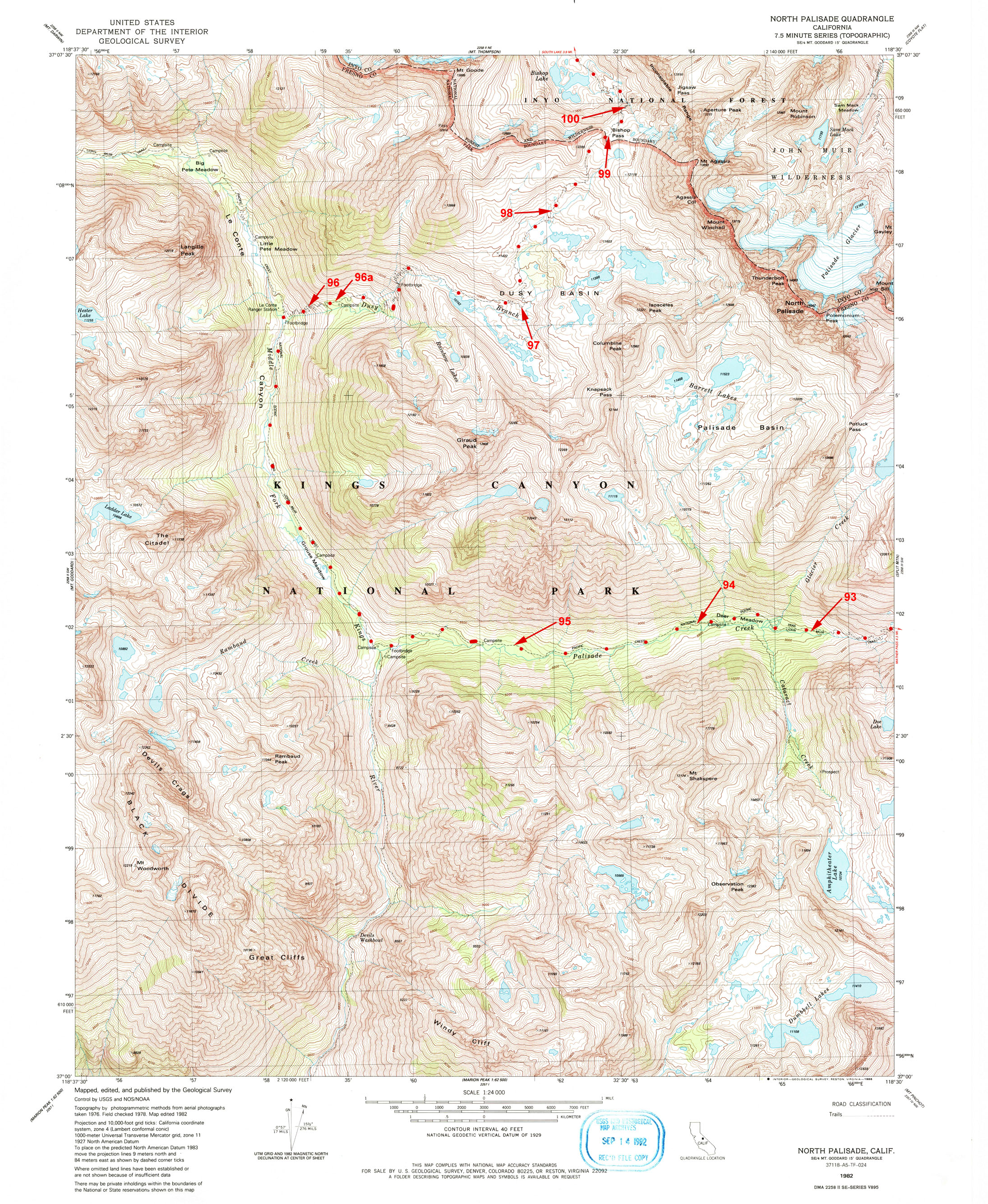 Locations of photographs marked with arrows. Trip route on trails marked with red dots.
