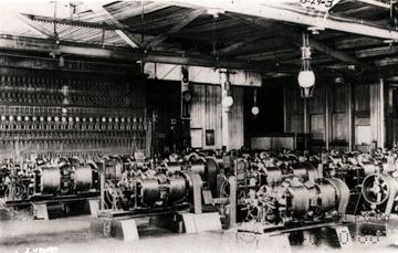 A central station with numerous Brush dynamos. Note Brush arc lamps hanging from ceiling - see page on Brush arc lights for a photo of this type of lamp. � Case Western Reserve University |