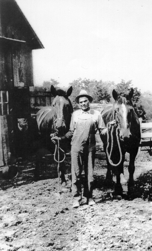 John O. La Favre and his horse team LaFAVRE FAMILIES - Floyd La Favre Four La Favre brothers born of French Protestant ancestry in southern Indiana came to Union County. John S., the oldest, came in 1854 with the sole property of one horse. He started working at $25 a month, and before his death in 1921 had acquired 600 acres of timberland and prairie stretching along the north side of a line about where Highway 34 now runs. It extended from Grand River east to Thayer. He was postmaster for eight years in Thayer and for a time co-owner of a general mercantile and hardware store there. But the site of his home was on the north-south road now followed by Highway 169, about half a mile north of its intersection with No. 34. This was also a stage-stop before the railroad came. John and his wife Sarah, nee Ladema, had six children born here, four of whom were still living in 1887 - Lydia, Catharine, Jacob B. and Jane. John S. served in Co. H 29th Regiment, Iowa Volunteer Infantry, from Dec. 1, 1862 to July 1865. He was also a member of the Masonic Order and highly esteemed. John S. & Jacob, his brother, are buried at West Union Cemetery, Thayer. Jacob, the second brother, lived here from 1864 till his death in 1900. He owned several hundred acres of bottom land and adjoining hills along Grand River south of the C.B.& Q. Railroad. He married Sarah J. Moores, a widow, and to them was born one daughter, Minta, who married Edward Smith. The third brother Samuel and his wife Margaret did not come from Indiana till 1882, but then they lived in this county 38 years, part of the time on a farm in New Hope Township. Seven children were born to Samuel and Margaret, but only four survived them; Cora Franklin of Creston being the last in this county. Samuel had served three years and two months in Co. H 33rd Reg't. Indiana Infantry during the Civil War. Samuel is buried at Losimoz(?), IA. Daniel, the youngest of these brothers, was also a war veteran, having served in the same company as Samuel. He seems to have had little contact with Union County except living on a rented farm about 1875. John La Favre whose father was a first cousin of these four brothers, came from Lucas County in 1881 and worked for Jacob. He put in an O for a middle name to distinguish him from John S. In February, 1893, he married Minta LaFavre's closest friend, a schoolteacher named Mary ("Mollie") E. Huntzinger. From Jacob this young couple bought 80 acres lying along the north side of the railroad and to the south of the above-mentioned intersection of Highways 169 and 34. Later they bought at least 100 acres more land to the west and continued general farming and stock-raising until they sold the home and moved to Afton in 1919. John O and Mollie were very hard-working persons, active in church and community affairs and (my copy ends here).