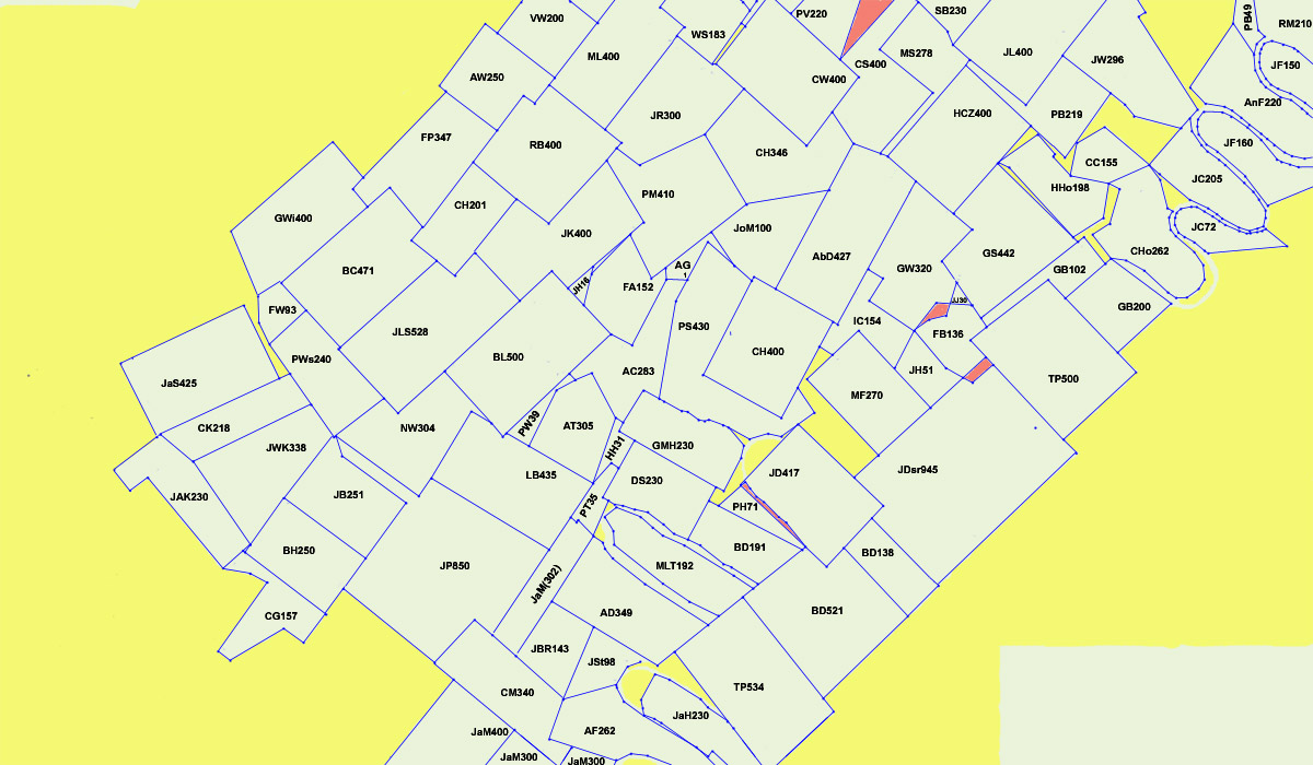 Red areas indicate overlap of adjacent tracts - see this page for map legend