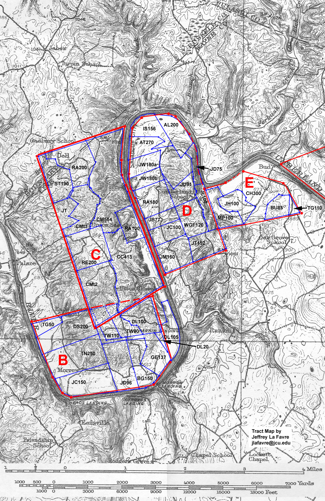 6 AUG 1791 - granted to Thomas Carneal - 460 acres The blue-bounded tracts are labeled with the initials of the owner and the number of acres. The labels are listed below. Included on the line with the label is the full name of the owner, followed by the deed reference and the date of the deed. For example, AL200 - Abraham Lefever (III) B:100 (6 MAR 1813) is a 200 acre tract owned by Abraham Lefever (III). Abraham's deed is recorded in the Wayne County, Kentucky, Deed Book B, starting on page 100. The deed is dated March 6, 1813. For further details about the tracts listed below, see the tract history page.