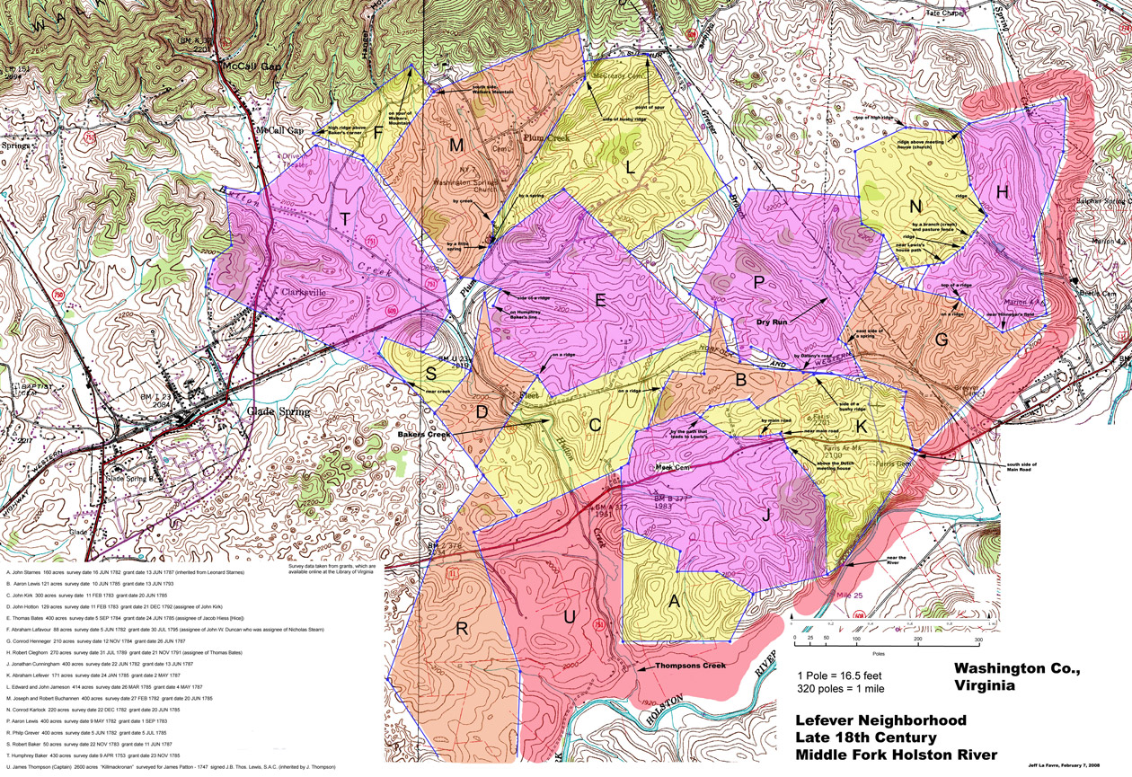 Map of Abraham Lefever properties and neighbors,Thompsons Creek and Bakers Creek (Hutton Creek), also Dry Run (Greever Branch), Washington County, Virginia. Jeffrey La Favre - jlafavre@gmail.com For a map of tracts between the middle and south forks of the Holston River, CLICK HERE. The earliest survey in this area was on March 14, 1746, for a 2600 acre tract named "Kilmackronan," owned by Col. James Patton and surveyed by John Buchanan, deputy surveyor for Augusta County, Virginia. James Patton was one of the original magistrates of Augusta County, VA, when it was organized in 1745. This tract was inherited by Captain James Thompson, son of Mary Patton and William Thompson, and grandson of James Patton (History of Southwest Virginia 1746-1786 Washington County 1777-1870 by Lewis Preston Summers). Apparently, the first settler to this area was Samuel Stalnaker, who arrived in 1750 with his wife, Susanna, and son, Samuel. In March of 1750, Samuel erected a cabin with the assistance of Dr. Thomas Walker and party, who were passing though the area on an expedition. At the time, Stalnaker was located at the western edge of the English frontier. On June 18, 1755, the home of the Stalnakers was attacked by Indians and Samuel and his wife were taken prisoner. Samuel's mother and four children escaped. Susanna apparently died soon after the attack or during captivity. On May 10, 1756, Samuel escaped from the Indians and arrived in Williamsburg in early June. He did not return to his home on the Holston River for a number of years (the last known record for him is from an English traveler who visited him there in 1769) (M. Lisa deGruyter, 2006). Another early settler to this area was Humphrey Baker, who arrived in 1752. On April 9, 1753, a survey of 430 acres (tract T on map) on Stalnakers Creek (Bakers Creek) was conducted for H. Baker. On May 3, 1755, Shawnee Indians attacked the home of Humphrey Baker and wounded daughter Mary Baker. In November of the same year Humphrey moved his family to Bedford County, VA to avoid any further attacks during the French and Indian War. In 1767 Humphrey moved his family back to the property on Stalnakers Creek. Humphrey and sons Thomas, John and George are on the 1770 Tithables list for Botetourt Co, VA (presently Washington Co.). In 1774, son George was granted land at Bakers Gap, adjoining Humphrey's land (this property later owned by John McCall - note McCall Gap label on map below). In 1788 Humphrey Baker sold his 1753 survey on Bakers Creek to John Hatton (Hutton) Sr.(Humphrey Baker DNA Family Group, 2005). The French and Indian War, 1754 - 1763, created an environment of hostility in southwestern Virginia, causing a complete abandonment of settlements by whites. During the winter of 1768 and early 1769, many settlers moved into the present boundaries of Washington County, VA, during a period of relative safety from Indian attacks (History of Southwest Virginia 1746-1786 Washington County 1777-1870 by Lewis Preston Summers). Below is a list of individuals who acquired land in the Lefever neighborhood before and after the French and Indian War. A number of these tracts were settled just prior to the Revolutionary War and some were originally surveyed near the end of the colonial period. After the war, commissions were established to certify the earlier settlements. The commission for Washington and Montgomery Counties certified property rights for a number of the tracts on the map below. Due to changes in government after the revolution, new surveys were conducted and were submitted to the land office of Virginia, who provided land grants. In cases where there were both pre- and post-revolution surveys, the acreage did not always match. The variance in acreage may have reflected a true change in the tract of land owned, as was the case for tract K owned by Abraham Lefever (261 acres surveyed June 8, 1774 and 171 acres surveyed February 24, 1785). The Washington County Surveyors Record 1781 - 1797 contains the survey data for surveys conducted after the war. In addition, when these surveys were based on settlement prior to the war, a copy of the commission's certification was commonly included in the survey record. The certification specified the year of settlement and also the date of any previous survey. Some of the certifications also specified previous owners of the land. When a settlement date is given, the identity of the settler is not always clear, particularly if previous owners are specified. List of Properties . Use the links below to examine transcriptions of the survey data contained in the land grants and surveys (land grants available online at Library of Virginia). A. John
