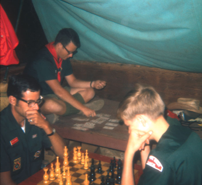Brad Cahoon (foreground-left), Pat Willits (foreground-right), Bill Rice (background). Staff free time, inside a staff tent.