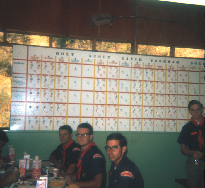 Staff dining hall. Seated front to back: Brad Cahoon, Bill Rice, Jeff La Favre.