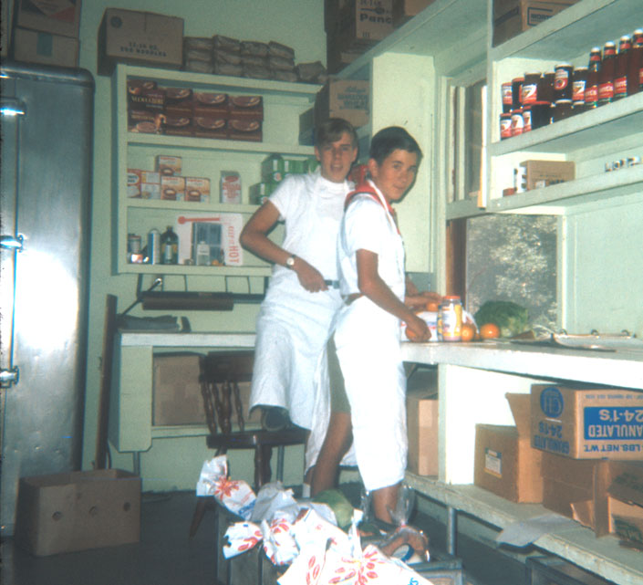 Scouts prepared their own meals while camping at Holt Scout Ranch. Here the commissary staff is packaging the ingredients for the day's meals. Rick Hurd is in front and Pat Willits is in back.