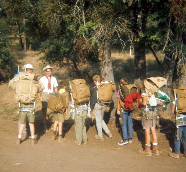 Scouts starting out on a backpack trip. Staff member is Daryl Smetana.