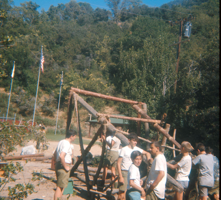 Scouts constructing a tower.