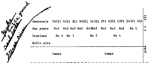 May the 1st A.D. 1863 it was a beautiful morning. The rules and regulations of the army of the Cumberland may be different to others. So I will state the duty of the pickets. The pickets call is at half past seven A.M. Then they fall in line and count off. And the squad consists of a detail from each company and one lieutenant and one sargent and 3 or 4 corporals. And they march to brigad headquarters. And the detail from each regt forms together and marches to devision head quarters and load guns. And there the whole detail from the whole devision forms and devides off in four squads and goes to each station. There is 4 stations. And each station has from 1 to 3 posts and each outposts sends out from 3 to 5 centenals. I will mark it out. |