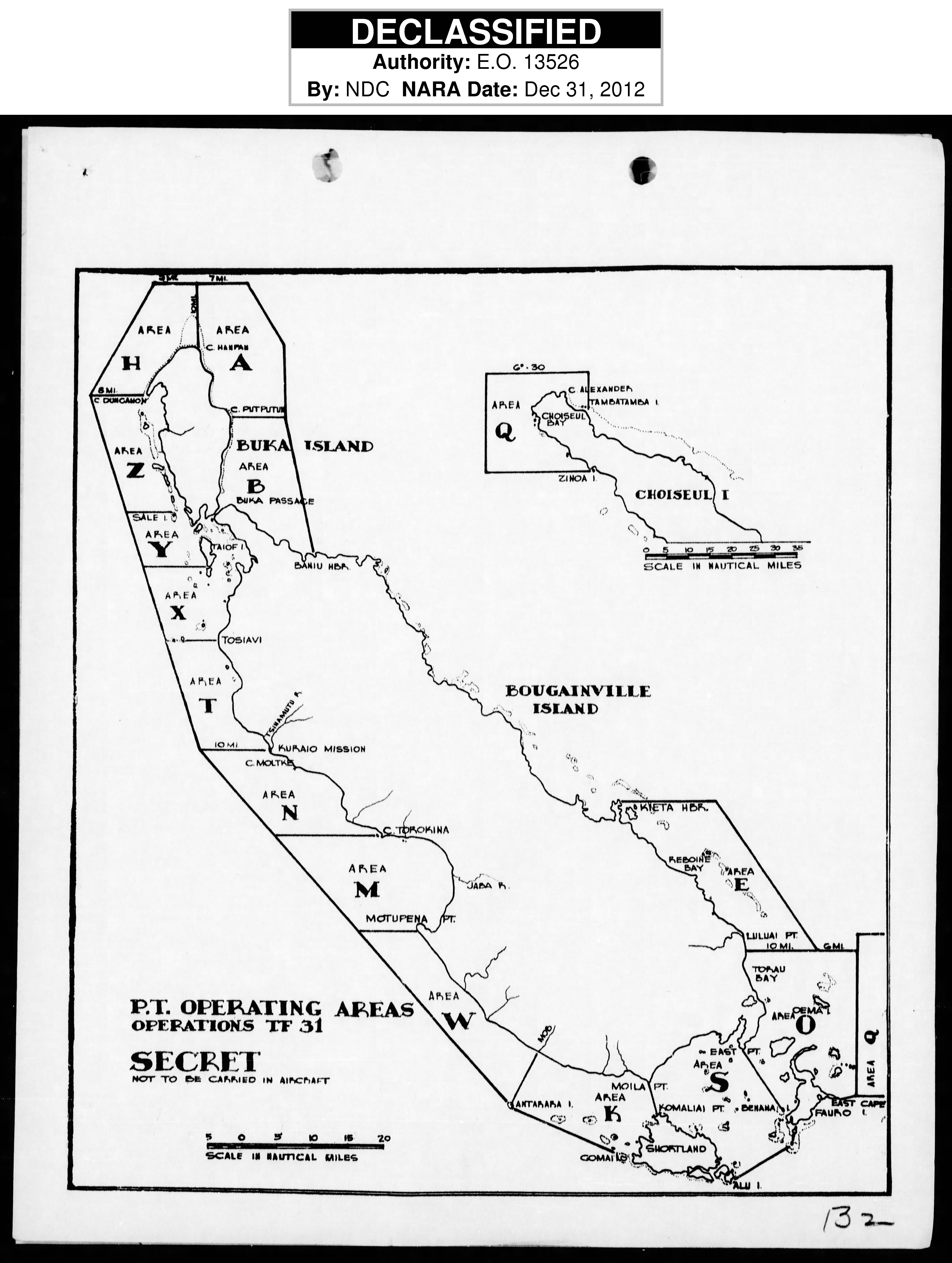 "The barges destroyed were sunk in St. George Channel between the Duke of York Islands and Southwest New Ireland, where the only known barge traffic in the area was encountered during the period. Because the excessive distances from the PT base at Green Island or Emirau Island to this barge route considerably reduced the period of effective patrol, and since the enemy barges were frequently accompanied by heavily armed . . . escort barges which demonstrated a superiority in fire power over PT's as well as the ability to withstand gunfire, task units of LCI and PGM gunboats are being employed to intercept and destroy this barge traffic. From dusk to dawn these units patrol close inshore along New Ireland between Huru Point and Labur Bay and retire northwestward out of sight of land during daylight for a period of 3 to 4 days and nights. On the final night of the patrol the gunboats bombard piers, loading areas and barge hideouts along the New Ireland coast before returning to their bases via St. George Channel.