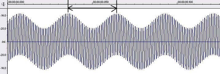 Wave trace for a mixture of a 965 Hz tone with a 1000 Hz tone. Here we see the classic wave pattern for two closely spaced frequencies that result in beating. A careful examination of the wave trace reveals that there is a cyclic variation in the wave amplitude (height of the waves).
