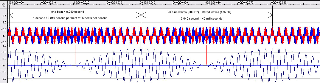 Beating Patterns in Wave TracesJeff La FavreJeffrey La Favre - jlafavre@gmail.com The illustration below is helpful in understanding the cause of beating. For demonstration purposes, a 475 Hz tone was mixed with a 500 Hz tone using computer software. In the upper wave trace, the wave pattern of the 475 Hz tone (red) is overlaid on the 500 Hz tone (blue), as they would appear if not mixed together. Along the upper trace there are three locations where the waves of the two tones are in phase. That is, the positive peak of one tone lines up with the positive peak of the other tone. These locations are marked with black vertical lines. When the tones are mixed together, they produce a wave trace like the one at the bottom of the illustration. Note that this complex tone has a periodic fluctuation in the wave amplitude (amplitude modulation). This periodic fluctuation is known as beating. The bottom wave trace can be understood by comparing it to the upper trace. Find the two locations on the bottom trace marked with red vertical lines. At these points there is no amplitude (height) in the wave trace. Look at the same points on the upper trace. At these points there is a positive blue peak for the 500 Hz tone and a negative red peak for the 475 Hz tone. The amplitude values for both tones at these points are the same, except the 500 Hz tone is positive and the 475 Hz tone is negative. When mixed together, the positive and negative peaks result in a peak with 0 amplitude (i.e., no peak at all). In contrast, at the points marked with the black vertical lines, the waves for the 500 Hz tone are lined up with the waves for the 475 Hz tone. At these points the waves of the two tones are said to be in phase. Since the peak amplitudes for both tones are positive, when mixed together, they result in waves with an amplitude two times the height of each individual tone wave. |