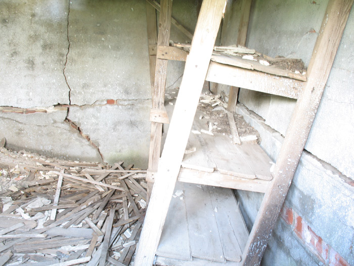 Stairs to second floor. Pillar with dark hole is chimney, the stove pipe was connected to chimney at hole. The second floor was not heated. The interior walls and ceiling are lath and plaster. - September 24, 2007
