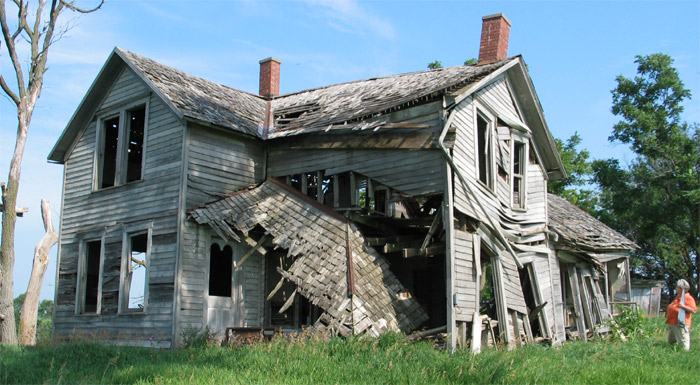 South and East Sides of House - July 25, 2007. In this photo you can see the joists of the second floor hanging unsupported behind the collapsed porch roof.