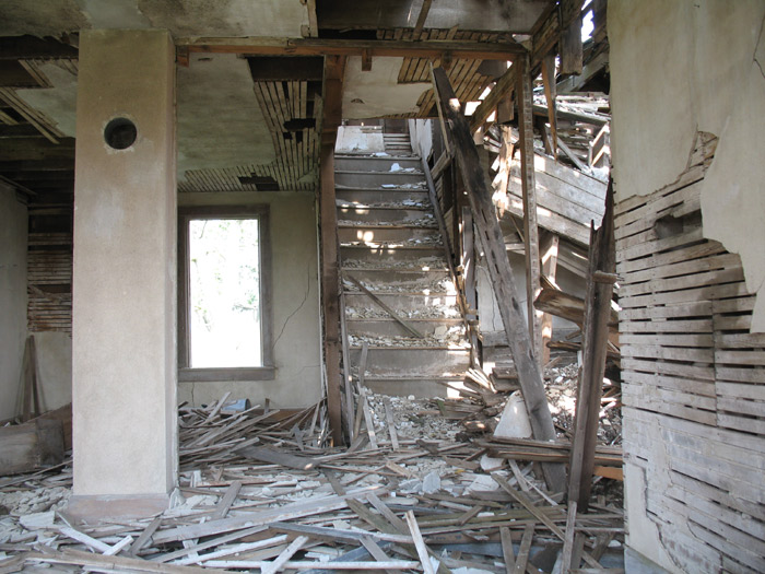 Second floor collapsed - September 24, 2007. On the left is the collapsed porch roof. On the right you can see what is remaining of the front second floor, now collapsed, with the north portion leaning up against the north wall of the room. It is apparent that many shingles on the roof are now missing and the weather will take this house down soon. I feel very fortunate to have seen this house before its complete collapse.