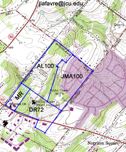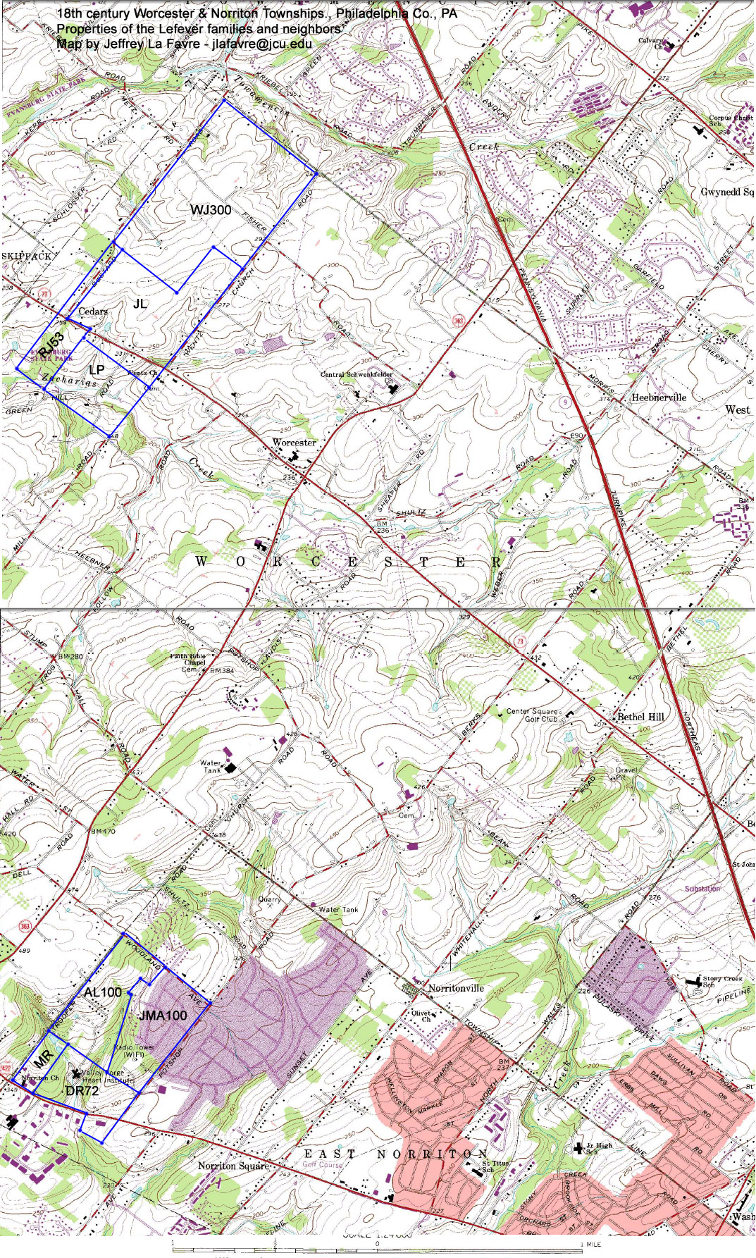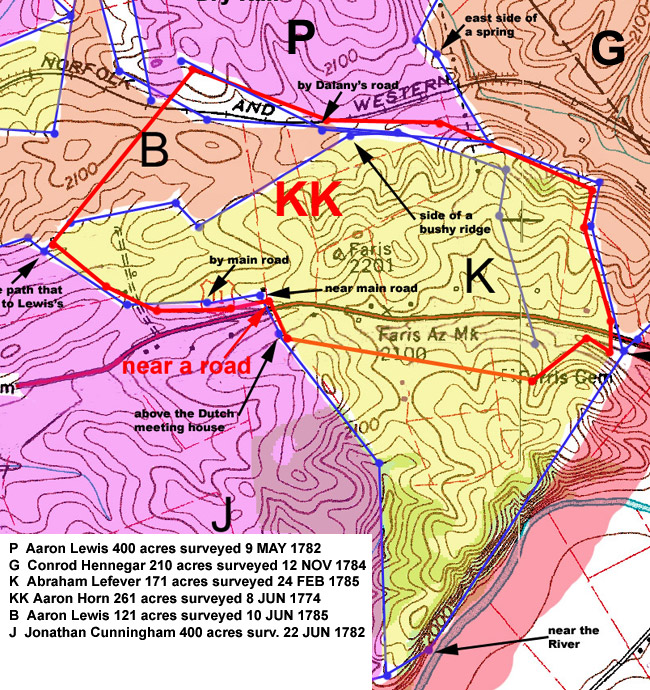 Abraham served on the Northampton County Grand Jury in June of 17591 and was a witness to the baptism of his sister's child, Abraham Van Etten, on May 2, 1760.6 The baptism was most likely performed in Northampton County. Abraham moved to Norriton Township, Philadelphia County, Pennsylvania, where he purchased 200 acres on January 15, 1761.56 On October 22, 1766, he and his wife, Elizabeth, sold half of the tract to John Martin Abish.1, 56 The following is the description in the deed of the land sold: Beginning at a corner of Mathias Rittenhouses land thence by the same North 49 degrees 30 minutes West 62 perches to a stone thence by the other land of Abraham Lefevre the five following courses, North 22 degrees 45 minutes East 127 1/2 perches, to a stone, North 47 degrees 45 minutes West 5 1/2 perches to a stone, North 46 degrees 30 minutes East 30 perches to a stone, South 47 degrees 45 minutes East 18 perches to a stone, North 42 degrees 15 minutes East 35 perches and thence by the same South 46 degrees 20 minutes East 88 perches 3 feet to a stone in the line of Robert Shannons land thence by the same and lands of Jacob Slough and the late James Shannon South 42 degrees 15 minutes West 181 1/2 perches to the place of beginning - 100 acres 90 perches. Abraham's land in Norriton Township was mentioned in a deed of a neighbor, Matthias Rittenhouse, who sold 72 acres and 148 perches to his son, David, on January 12, 1770.2 The description of this tract allows us to locate Abraham's land. The Old Norriton Presbyterian Church, erected in 1698, still stands today (see this web page). This church is said to be located on a corner (the north west corner) of the Rittenhouse land (see this web page). Here is the description of David's land in the deed: "Beginning at a large Black Oak tree marked for a Corner. Thence, by Land of Doctor Robert Shannon North forty two degrees and an half East ninety seven Perches to a Stone. Thence by land of Christian Recup and Abraham Lefever North fifty degrees West, one hundred and thirty four Perches to a Stone. Thence, by other part of the said Matthias Rittenhouses Land South forty two degrees and an half West ninety five Perches to a Stone in a line of Ephraim Armstrongs Land and at the Manhatawney Road. Thence, down the said Road South Sixty two degrees East ninety two perches to a Stone. Thence by other part of the said Matthias Rittenhouses Land, South thirty two degrees West, Twenty Six Perches to a large Whiteoak in a line of the afforesaid Ephraim Armstrongs Land. Thence by the same South fifty degrees East thirty nine perches to the place of beginning." The Manhatawney Road became the Philadelphia, Germantown and Perkiomen Turnpike Road sometime between 1801 and 1804. If we plot the Matthias and David Rittenhouse tracts on a modern topographic map,with the north west corner of Matthias' tract at the intersection of Germantown Pike and Trooper Road, the border of the tracts aligns well with Germantown Pike. Then it is an easy matter to plot Abraham's land adjacent to David's. A large scale map is provided HERE. This map includes most of Worcester Township as well because this area was important to the Lefever family history. If we plot a route by modern roads, it is apparent that Abraham had to travel four miles from his home to worship at Wentz's Church on Skippack Pike in Worcester. While we don't have the description of Abraham's original 200 acres, the deed of sale for half the land in 1766, coupled with the description of David Rittenhouse's land, allows us to reconstruct an estimated description as follows: Beginning at a corner of Mathias Rittenhouses land thence by the same North 49 degrees 30 minutes West 172 perches, then North 42 degrees 15 minutes East 190 perches, then South 46 degrees 20 minutes East 172 perches, then South 42 degrees 15 minutes West 181 1/2 perches to the beginning. A plot of the tracts in Norriton is provided below (MR = Matthias Rittenhouse, DR72 = David Rittenhouse, JMA100 = John Martin Abish, AL 100 = Abraham Lefever [I])