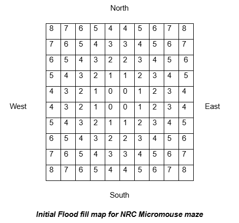 We use the flood-fill map to find a pathway to the center. The robot starts in a corner cell that has a value of 8. The rules state there will be walls on all sides of the start cell except in front of the robot. If the robot is located in the southwest corner, then its first move will be to the north. After completing that move the robot will be in a cell with a value of seven. For the next move the robot should move to a cell that has a lower flood-fill value than seven. The cells ahead and to the right both have values of six. The program includes the logic that the robot should move forward if possible rather than make a turn if the flood-fill values are the same. As the robot lands in the second cell, the sensors are fired to determine the presence of walls to left, front and right. The walls detected are added to the initial wall map of the maze. Then the robot will make a decision on which movement it should make to go to the third cell (u-turn, right, left or forward). All the while the robot will continue to move to cells with lower flood-fill values, which will ensure that it eventually finds a center cell. You can satisfy this yourself by using the flood-fill map above and making imaginary moves. To make it simple, just assume no internal walls. If you keep making moves to lower flood-fill values, you will find your way to the center! When the robot visits a cell, it increases the flood-fill value of that cell. In this way, it is less likely that the robot will return to cells it has already visited as it explores the maze. While the above code description can be applied to any robot, the code for making the robot move will be more specific to the robot. Our GEAR members spent much more time on this part of the coding. Odometry was used to determine how far the robot should move traveling cell to cell. The robot stops briefly in each cell, fires all sensors to discover the walls of the cell, determines which move to make, then moves to the next cell. Odometry was possible because the motors are equipped with encoders which can be used to determine the amount of wheel rotation. Considerable time was spent on calibrating the sensors and developing code to reliably detect the walls of each cell. GEAR club owns a maze that is the same as the one used at the NRC. Much testing in the maze was done while developing the drive code for the robot. We believe this is essential in developing a program. |