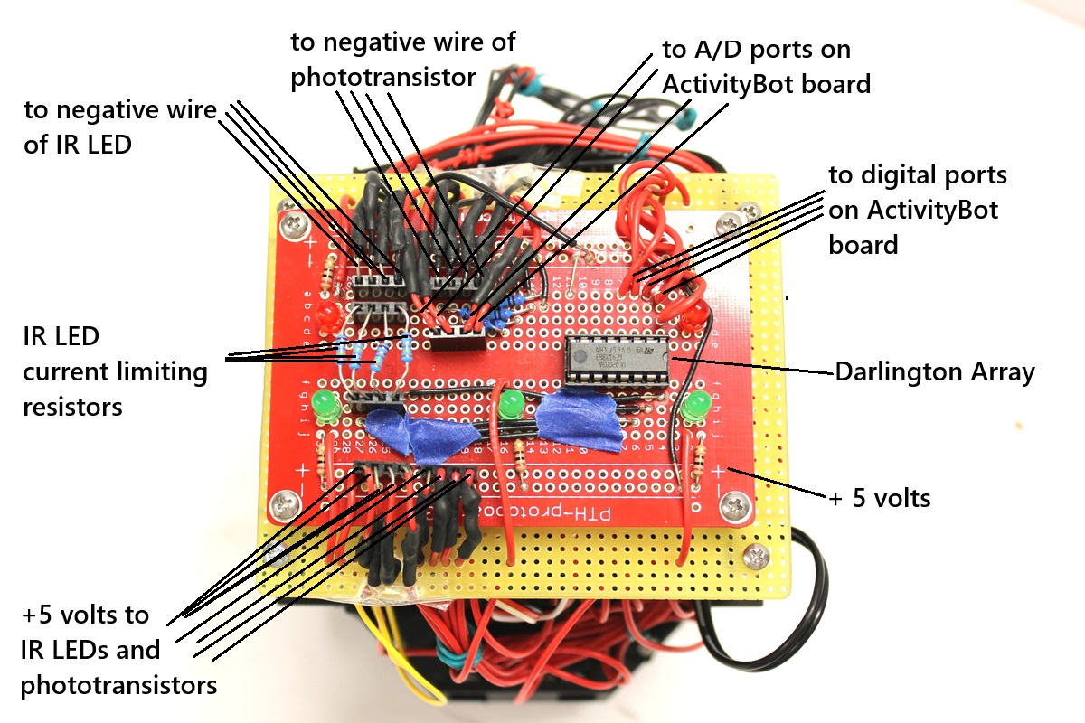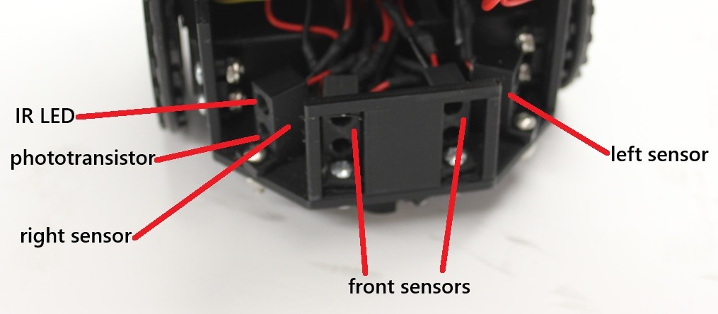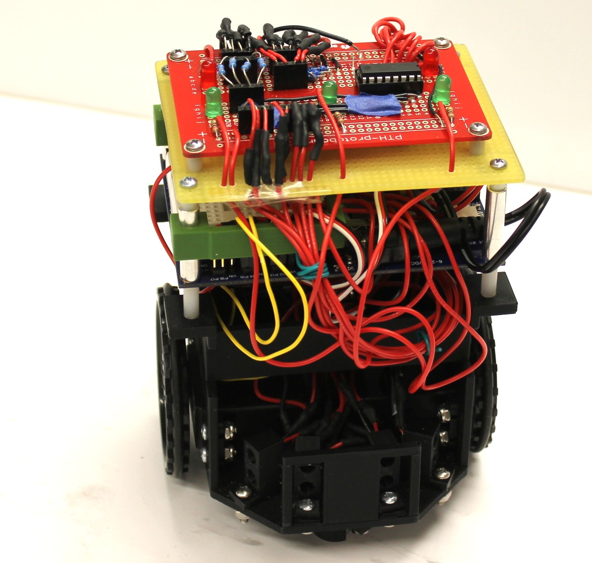 Description of Robot Main robot board is an ActivityBot 360 WX from Parallax. This board contains the microprocessor and memory storage for the program. It also contains the electronics for controlling the two motors. In addition, the board contains digital input/output ports and analog to digital input ports used to control the custom-made IR sensors. The robot motors are continuous rotation servos with internal encoders from Parallax. The robot contains four IR sensors assembled from electronic components by Jacob and Caleb. The control board for the sensors (the red one) is mounted at the top of the robot. All of the individual components of this board were soldered by hand by Jacob and Caleb. The control board also contains three green LEDs and two red LEDs which are connected to digital output ports of the ActivityBot board. The LEDs serve as visual indicators of specific events. For example, the green LEDs indicate wall detection. As the robot visits a cell of the maze, it must determine which sides of the cell contain a wall. After the walls are detected, the robot program makes a decision on which direction to move (straight ahead, turn right, turn left or make a u-turn). If all three green LEDs light up when the robot arrives in a cell, then that cell contains walls to right, left and to the front. Since there is no way forward, the robot must make a u-turn. If only the left green LED lights up, then there are possible pathways straight ahead and to the right. The program will decide which is the better choice. The body of the robot was modeled using Onshape software and 3D printed. The IR Sensors Each sensor contains an IR LED and an IR sensitive phototransistor housed in a 3D printed body. The body is mounted to the frame with only one screw so that the sensor can be rotated to point in a specific direction. To make a distance measurement to a wall, the IR LED turns on to send out a beam of infrared light. The light reflects off the wall and returns to the phototransistor which detects the infrared. The closer the wall is to the sensor, the more IR detected. The phototransistor output is connected to an analog to digital port on the ActivityBot board. The signal is forwarded from the port to the analog to digital chip on the ActivityBot board. This chip converts the voltage (0 to 5 volts) to a digital value (0 to 4096). The Sensor Control Board All components on this board were soldered by Jacob and Caleb. Five volt regulated supply for this board comes from the ActivityBot board. All eight components of the sensor bank are supplied +5 volts from the control board. The negative wires of the IR LEDs and phototransistors are connected to the board as labeled. The current path returning from the IR LEDs passes through a current limiting resistor, then to an output pin on the Darlington array. This is an array of switching transistors. The transistors are turned on and off to supply current to each IR LED at the appropriate time. The transistor bases (which control the transistors) are connected to digital output ports on the ActivityBot board. When a measurement is called for in the program, 3.3 volts is output from the digital port on the ActivityBot. This causes the transistor of the Darlington array to turn on, which in turn allows current to flow through the IR LED. The output (negative wire) of the paired phototransistor is routed to a A/D port on the ActivityBot board. Synopsis of the program for solving the maze Unlike the Robot Maze Contest, the layout of the maze for the Micromouse Contest is not published in the NRC Contest Manual. Therefore, developing a program to solve this maze is considerably more difficult. The program for the GEAR robot was written in C language. The logic for finding the target includes the so-called flood-fill algorithm. We start with the knowledge that the maze contains 100 cells in a 10 X 10 grid. The robot starts in one of the corner cells and must find one of the four central cells. Imagine that you have a maze of this size but without any internal walls. You pour water into the central cells and watch it flow to the corners. The water proceeds first to the neighboring cells of the center ones and so on. If we number the central cells with a value of zero, those adjacent to them with a value of one and so on, we can develop a map of the maze containing flood fill values. In addition, a map of the walls of the maze is created early in the program. The only walls known at the start of a robot run will be those around the perimeter. The initial map contains only the perimeter walls. As the robot explores the maze, it will discover the internal walls and add them to the map.