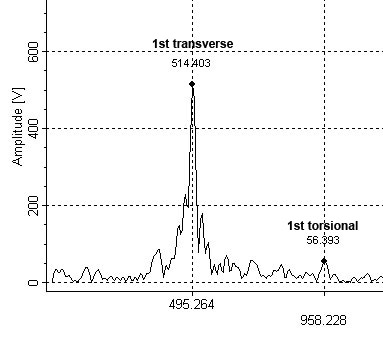Audio of the the bars struck at the corner was recorded digitally and subjected to analysis by Fast Fourier Transformation (FFT) to yield a spectrum for each bar. In most of the spectra, the first torsional mode was not evident. In four bars (E3, C4, G4, B4) a weak first torsional mode was found. The spectra for these bars are provided below.