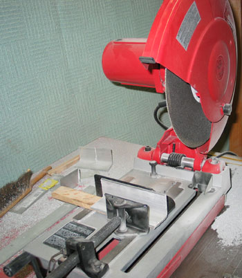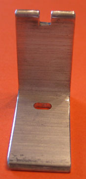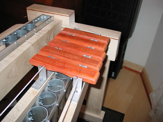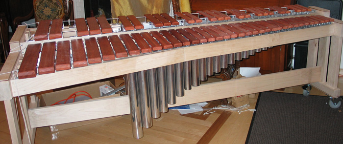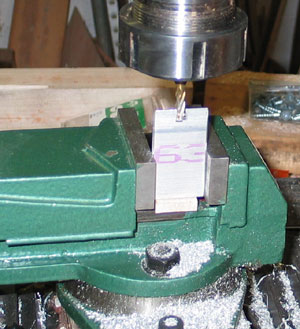 Building the Marimba - page 3Jeffrey La Favre - jlafavre@gmail.com Photo of finished bar post. The bar posts hold the cord that runs through the bars (see fourth photo below). Fabricated from 2 x 2 x 1/8 inch aluminum angle. Hole for mounting screw is slotted to allow alignment of bar post on the rail for proper centering of cord in u-shaped slot at top. Cut-off saw with abrasive wheel used to cut angle aluminum for bar posts. Milling the slot for the cord with a 3/16 inch end mill. Top five natural bars fitted to instrument. Felt will be glued to both sides of each bar post to prevent buzzing of bars against the aluminum bar posts. Installation of bars complete (bars are not finished or final-tuned yet) |