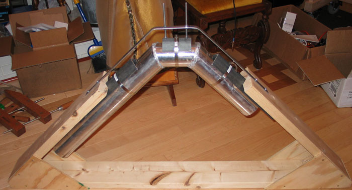 Jig used to hold bass resonator sections while brazing (photo below). Brazing rod used was HTS-2000. While the information supplied with the brazing rod suggested that a propane torch would work, I found that it did not produce enough heat for this application. A MAAP gas torch was obtained and found to work well. The first step is to bevel the tube edges at 45 degrees, which creates a v-groove at the joint. The groove provides a space for the brazing material to accumulate. The tube edges are "tinned" with brazing rod, rubbing the area with a stainless steel brush while the material is molten. This process promotes bonding of the brazing material to the aluminum. Then the tube sections are assembled into the jig and brazed together (but it is not as easy as it sounds). I have never been very good at welding or brazing, but after some practice, I managed to join the tubes in what seems to be a structurally sound (although not air tight) result. I had to learn how to keep the brazing material from draining through the joint. The trick is to heat on both sides of the joint, constantly moving back and forth just until the rod starts to melt when touched to the joint, then work along the joint quickly so that the brazing material stays put. Another problem was cracking of the joint. You have to develop a technique that does not result in quick changes in temperature of the tubing. I tried to make sure that a large area of the tubing was preheated with the torch, and to keep heating a little in the area of the joint after brazing to promote a slower decline in temp. Then examine the joint and if there is a crack, just do it over again.