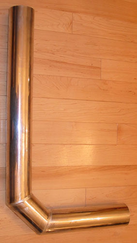 Finished resonator for E2 in photo below. After several frustrating tries to get a brazed joint without any pin holes, I decided to seal the holes by using JB Weld (epoxy for metal). The epoxy is a darker color than the polished aluminum, so the joints were painted with a chrome colored paint. The resonator was put in place on the instrument and an adjustable end stop was put in place. Then the stop was adjusted for maximum resonance. We (Katy and I) found that it was difficult to judge exactly where the optimum stop position should be. In any case, we finally selected a specific position and made a measurement of the stop. It was found to be 3/16th of an inch from the position I had calculated prior to the test. The calculation was done assuming that the tube length should be that of the median position (i.e., the length is measured along the center of the tube). The test confirmed that this is essentially correct. Therefore, I could proceed with cutting additional tubing for the remaining resonators. As of 3/2/04, two resonators have been brazed (E2 and F2, both L-shaped). Tubing has been cut for another 3 bass resonators (F#2, G2, G#2). There are a total of 11 bass resonators that must be mitered. So I hope to have these finished in about 2 weeks (ha ha ha).