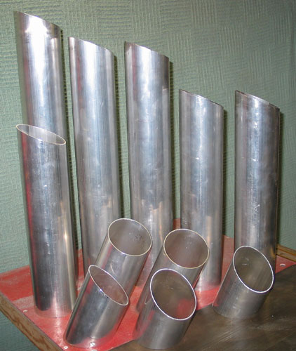 Resonator sections for C2, C#2, and D#2. These, along with the D2 resonator are 4 inch diameter tubes, the largest on the instrument. These tubes are not polished yet. Only three resonators (A2, A#2, and B2) remain to be cut as of 3/9/04.
