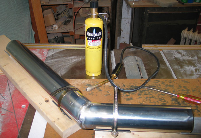 Simple jig used for brazing tubes with one miter. This jig was also used to braze the 3rd miter on resonators C#2 and D#2. The jig is made from two pieces of 2 x 6 framing lumber, each with a 4 inch section of 2 x 2 angle iron attached at one end. A piece of aluminum 2 x 2 angle was slipped under the open end of each tube and the 2 x 6s were shimmed as required to make the mitered ends align. Photo also shows the MAPP gas torch used for brazing. A brazing rod can be seen on the left side of the photo.