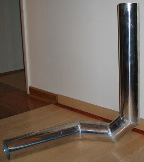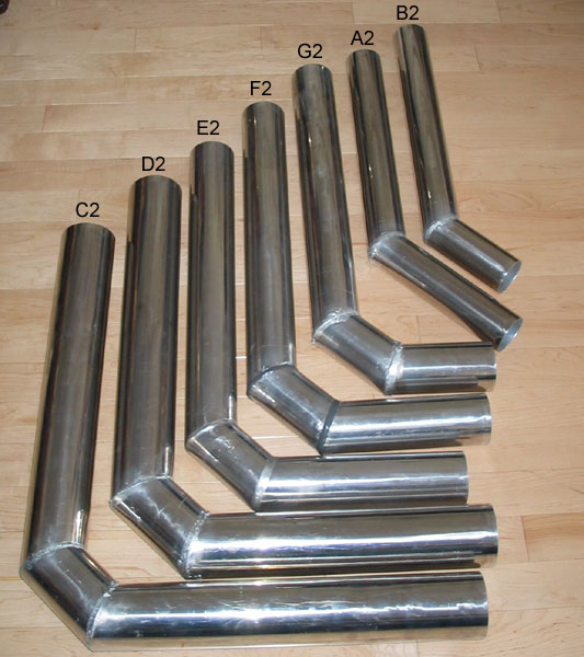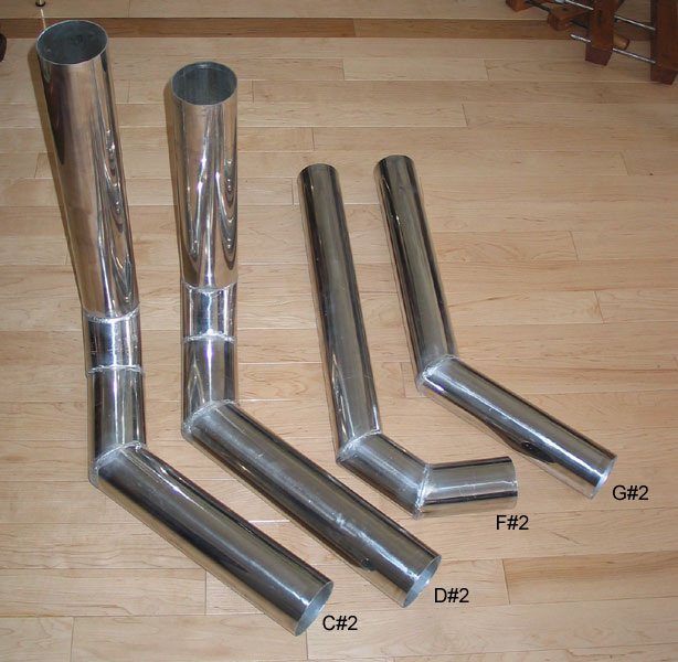 Bass resonators for natural bars. If you look closely, you will see that the F2 resonator angle does not match the other L-shaped resonators. The F2 was the second resonator I brazed and I made an error in the joint alignment. Nevertheless, it is still serviceable. The C2 and D2 resonators are 4 inch (OD) tubing, the E2, F2 and G2 resonators are 3.5 inch tubing and the A2 and B2 resonators are 3 inch tubing. The E2 resonator joints are finished (coated with epoxy and painted with chrome paint). The F2 resonator joints are coated with epoxy. The remaining resonators have only the brazing material at the joints, not filed down yet.