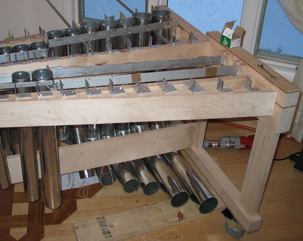 Photo below: attaching the natural bass resonators to the instrument. The bass subassembly is raised so that holes can be drilled into the top of the tubes (the rails are already drilled and are used as pilot holes for drilling the tubes). Each rail in the bass section is drilled with two holes per resonator as can be seen in the photo. At this stage only the top hole has a bolt, allowing the resonators to swing in a left-right direction. Shims will be placed between the tubes and the entire subassembly will be tied down. Then the bottom series of holes will be drilled into the tubes. Extra vertical length was added to the bass resonators to allow for alignment of the horizontal sections. The resonators still need to be trimmed at top to establish proper height above the rails.